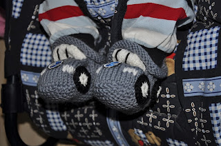 En uppdatering med några foton av ett par baby tossor jag fick på posten idag.. De är gjorda av en tjej i Litauen och beställda via Etsy ( http://www.etsy.com/shop/knittinghandmade )...och fullkomligt ursöta!!!!:) Är gjorda för en 3-6 månader gammal bebis men blev ju tvingen att sätta dom på honom direkt!
